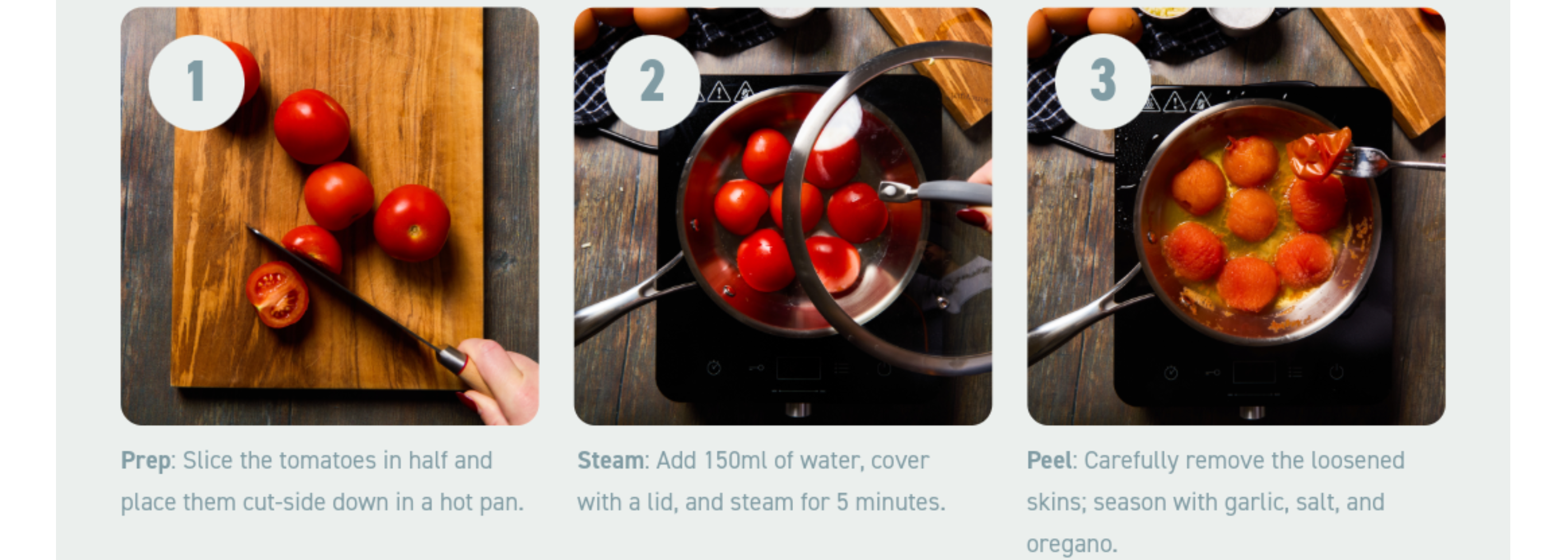 Steam the Tomatoes: Slice the tomatoes in half. Place them cut-side down in a hot pan. Add 150ml of water, cover with a lid, and steam for about 5 minutes.