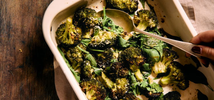 Simple, fresh and full of flavour – roasted broccoli and spinach finished with lemon, Parmesan and parsley